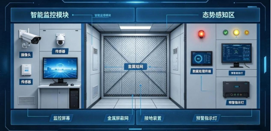 屏蔽效能在线监测:核心优势。可实时监测屏蔽机房的整体效能,一旦发现异常衰减(如因门体密封老化、接缝氧化导致),系统立即报警。这改变了国防领域传统依赖“定期送检”的模式,实现了7x24小时不间断的自身安全状态感知,符合战备值班要求。
