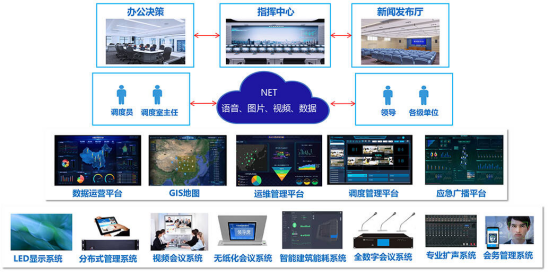 配置:VMS分布式/光矩系统、全数字会议系统、远程视频会议系统、会议录播系统、数据可视化平台。