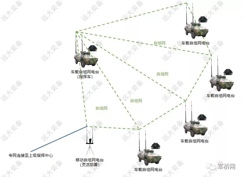 一、车联网自组网方案概述远大装备研制的车联网自组网电台通信系统,由车载自组网电台和移动自组网电台组成。车载自组网电台部署在指挥车和