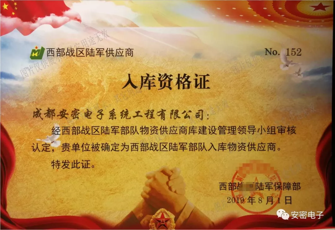 经西部战区陆军部队物资供应商库建设管理领导小组审核认定,我公司被确定为西部战区陆军部队入库物资供应商。此证书见证着安密电子的努力与