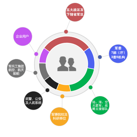 军委直属各部、厅、办公室等,五大战区及下辖省军区,陆、海、空、火箭军、战略支援部队、武警部队各军兵种;部队院校及科研单位;人武系统(人防办、人武部);军工、兵工科研单位及企业;航空、航天、船舶科研单位及企业等。
