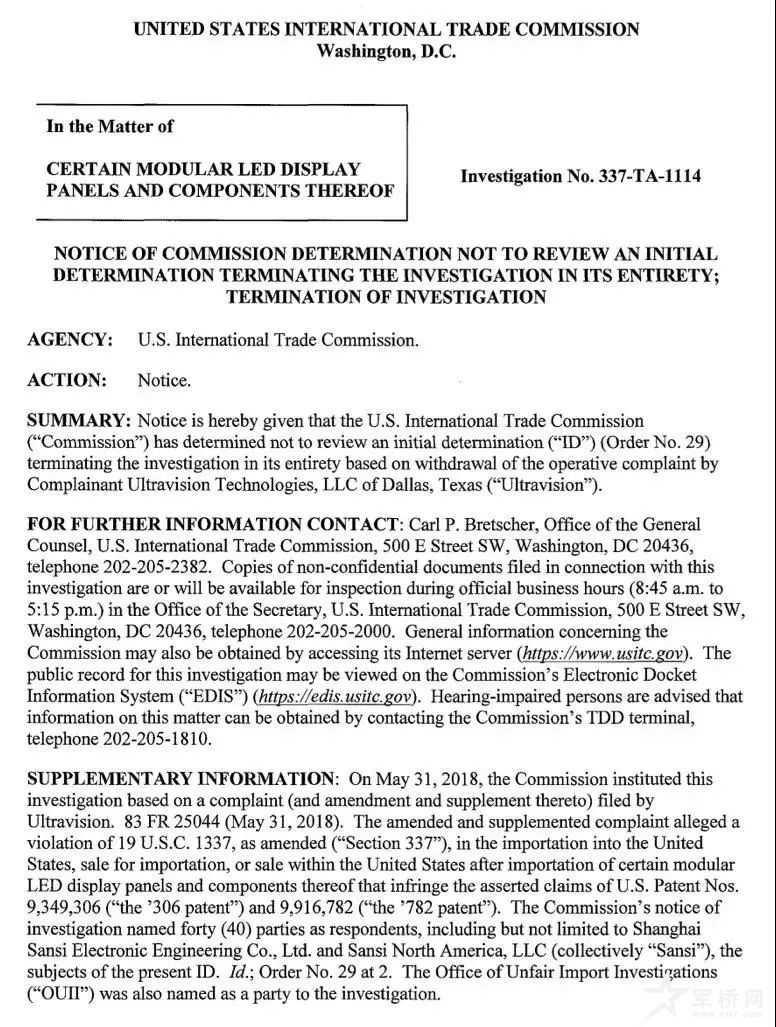2019年2月21日,美国国际贸易委员会(ITC)发布公告称,对涉华特定模块化LED显示面板及其组件(CERTAIN MODULAR LEDDISPLAYPANELS AND