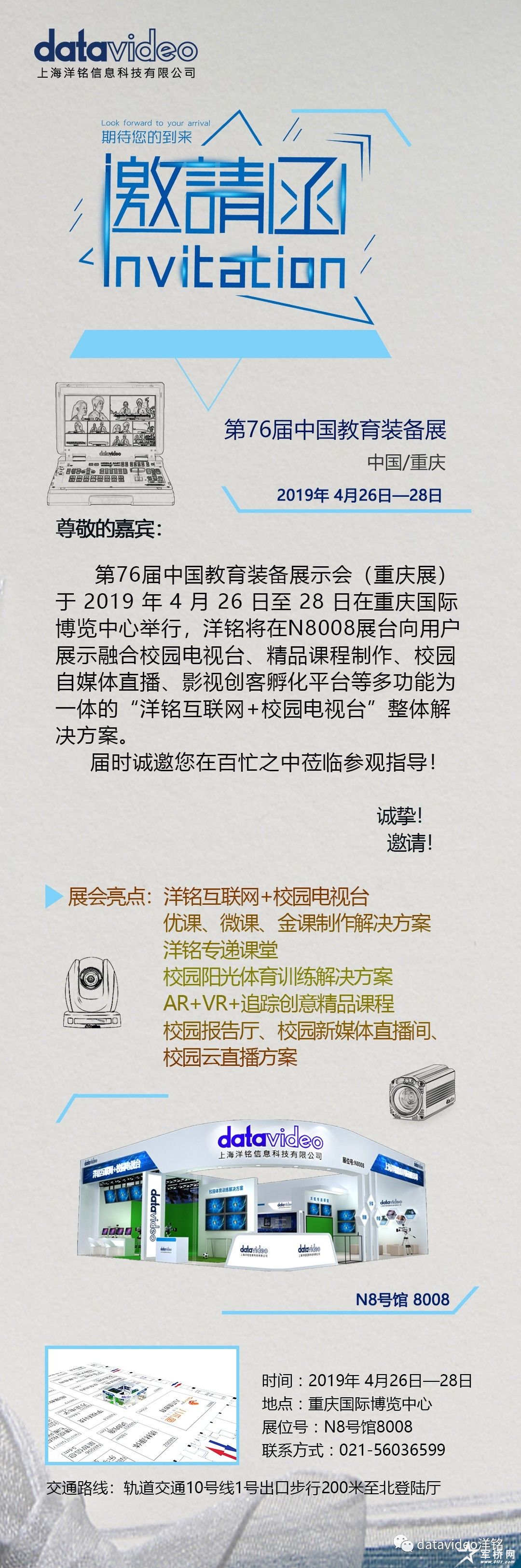 第76届中国教育装备展示会将于2019年4月26日至28日在重庆国际博览中心举行。洋铭将在此向您展示融合多功能为一体的洋铭互联网+校园电视台整
